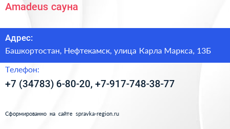 Amadeus, сауна по адресу Башкортостан, Нефтекамск, улица Карла Маркса, 13Б в дальнейшем Организация, размещена в следующих категориях: