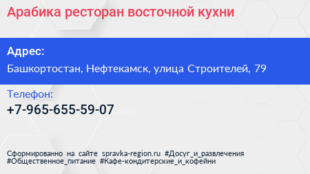 Арабика, ресторан восточной кухни по адресу Башкортостан, Нефтекамск, улица Строителей, 79 в дальнейшем Организация, размещена в следующих категориях: