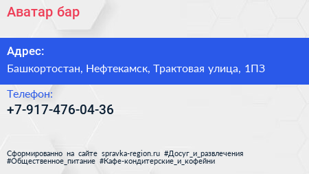 Аватар, бар по адресу Башкортостан, Нефтекамск, Трактовая улица, 1ПЗ в дальнейшем Организация, размещена в следующих категориях: