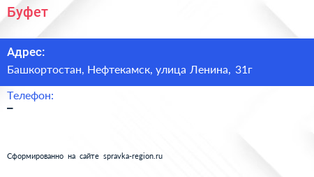 Буфет по адресу Башкортостан, Нефтекамск, улица Ленина, 31г в дальнейшем Организация, размещена в следующих категориях: