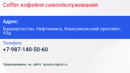 Coffer, кофейня самообслуживания по адресу Башкортостан, Нефтекамск, Комсомольский проспект, 43д в дальнейшем Организация, размещена в следующих категориях: