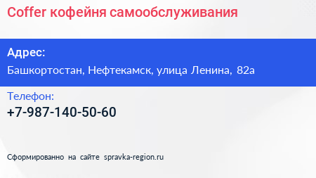 Coffer, кофейня самообслуживания по адресу Башкортостан, Нефтекамск, улица Ленина, 82а в дальнейшем Организация, размещена в следующих категориях: