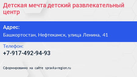 Детская мечта, детский развлекательный центр по адресу Башкортостан, Нефтекамск, улица Ленина, 41 в дальнейшем Организация, размещена в следующих категориях: