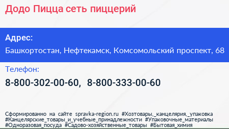 Додо Пицца, сеть пиццерий по адресу Башкортостан, Нефтекамск, Комсомольский проспект, 68 в дальнейшем Организация, размещена в следующих категориях: