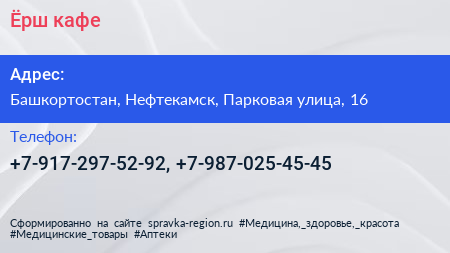 Ёрш, кафе по адресу Башкортостан, Нефтекамск, Парковая улица, 16 в дальнейшем Организация, размещена в следующих категориях: