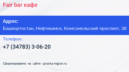 Fair & bar, кафе по адресу Башкортостан, Нефтекамск, Комсомольский проспект, 38 в дальнейшем Организация, размещена в следующих категориях: