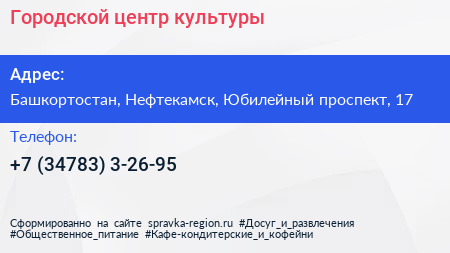 Городской центр культуры по адресу Башкортостан, Нефтекамск, Юбилейный проспект, 17 в дальнейшем Организация, размещена в следующих категориях: