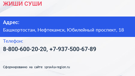 ЖИШИ СУШИ по адресу Башкортостан, Нефтекамск, Юбилейный проспект, 18 в дальнейшем Организация, размещена в следующих категориях: