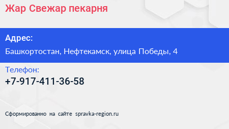 Жар Свежар, пекарня по адресу Башкортостан, Нефтекамск, улица Победы, 4 в дальнейшем Организация, размещена в следующих категориях:
