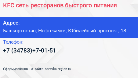 KFC, сеть ресторанов быстрого питания по адресу Башкортостан, Нефтекамск, Юбилейный проспект, 18 в дальнейшем Организация, размещена в следующих категориях: