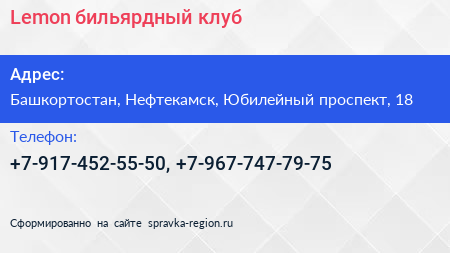 Lemon, бильярдный клуб по адресу Башкортостан, Нефтекамск, Юбилейный проспект, 18 в дальнейшем Организация, размещена в следующих категориях: