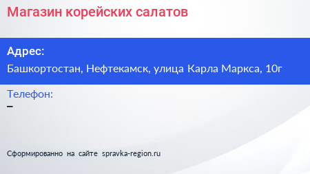 Магазин корейских салатов по адресу Башкортостан, Нефтекамск, улица Карла Маркса, 10г в дальнейшем Организация, размещена в следующих категориях: