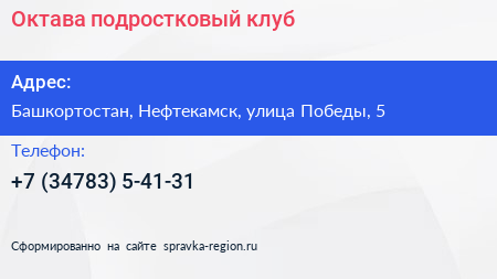 Октава, подростковый клуб по адресу Башкортостан, Нефтекамск, улица Победы, 5 в дальнейшем Организация, размещена в следующих категориях: