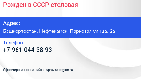Рожден в СССР, столовая по адресу Башкортостан, Нефтекамск, Парковая улица, 2а в дальнейшем Организация, размещена в следующих категориях:
