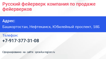 Русский фейерверк, компания по продаже фейерверков по адресу Башкортостан, Нефтекамск, Юбилейный проспект, 18Б в дальнейшем Организация, размещена в следующих категориях: