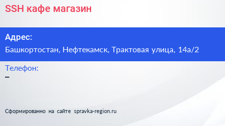 SSH, кафе-магазин по адресу Башкортостан, Нефтекамск, Трактовая улица, 14а/2 в дальнейшем Организация, размещена в следующих категориях: