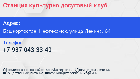 Станция, культурно-досуговый клуб по адресу Башкортостан, Нефтекамск, улица Ленина, 64 в дальнейшем Организация, размещена в следующих категориях: