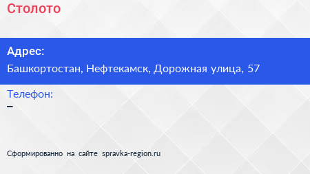 Столото по адресу Башкортостан, Нефтекамск, Дорожная улица, 57 в дальнейшем Организация, размещена в следующих категориях: