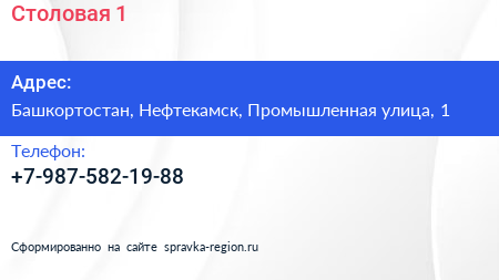 Столовая №1 по адресу Башкортостан, Нефтекамск, Промышленная улица, 1 в дальнейшем Организация, размещена в следующих категориях:
