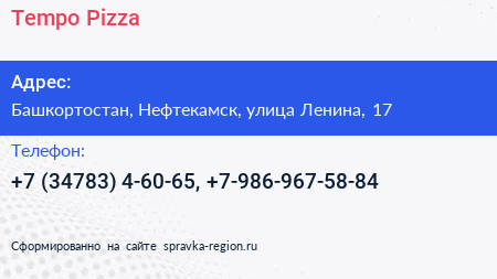 Tempo Pizza по адресу Башкортостан, Нефтекамск, улица Ленина, 17 в дальнейшем Организация, размещена в следующих категориях: