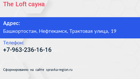The Loft, сауна по адресу Башкортостан, Нефтекамск, Трактовая улица, 19 в дальнейшем Организация, размещена в следующих категориях:
