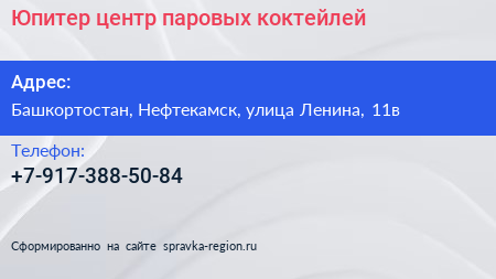 Юпитер, центр паровых коктейлей по адресу Башкортостан, Нефтекамск, улица Ленина, 11в в дальнейшем Организация, размещена в следующих категориях: