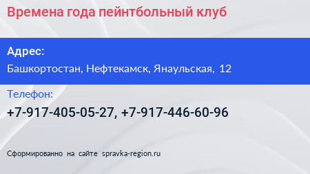 Времена года, пейнтбольный клуб по адресу Башкортостан, Нефтекамск, Янаульская, 12 в дальнейшем Организация, размещена в следующих категориях: