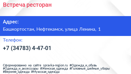 Встреча, ресторан по адресу Башкортостан, Нефтекамск, улица Ленина, 1 в дальнейшем Организация, размещена в следующих категориях:
