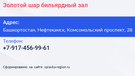 Золотой шар, бильярдный зал по адресу Башкортостан, Нефтекамск, Комсомольский проспект, 28 в дальнейшем Организация, размещена в следующих категориях: