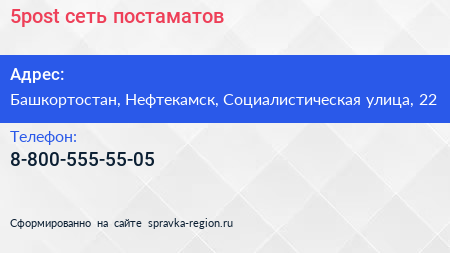 5post, сеть постаматов по адресу Башкортостан, Нефтекамск, Социалистическая улица, 22 в дальнейшем Организация, размещена в следующих категориях: