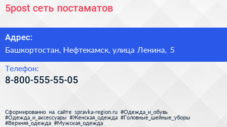 5post, сеть постаматов по адресу Башкортостан, Нефтекамск, улица Ленина, 5 в дальнейшем Организация, размещена в следующих категориях: