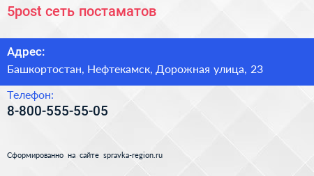 5post, сеть постаматов по адресу Башкортостан, Нефтекамск, Дорожная улица, 23 в дальнейшем Организация, размещена в следующих категориях: