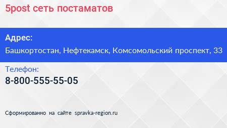 5post, сеть постаматов по адресу Башкортостан, Нефтекамск, Комсомольский проспект, 33 в дальнейшем Организация, размещена в следующих категориях: