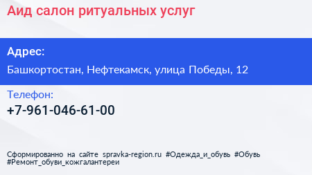 Аид, салон ритуальных услуг по адресу Башкортостан, Нефтекамск, улица Победы, 12 в дальнейшем Организация, размещена в следующих категориях: