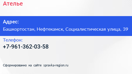 Ателье по адресу Башкортостан, Нефтекамск, Социалистическая улица, 39 в дальнейшем Организация, размещена в следующих категориях: