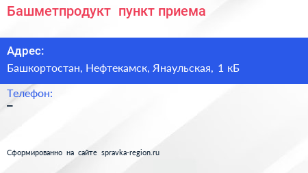 Башметпродукт+, пункт приема по адресу Башкортостан, Нефтекамск, Янаульская, 1 кБ в дальнейшем Организация, размещена в следующих категориях: