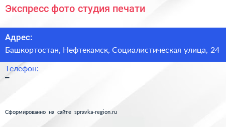 Экспресс-фото, студия печати по адресу Башкортостан, Нефтекамск, Социалистическая улица, 24 в дальнейшем Организация, размещена в следующих категориях: