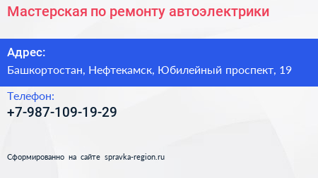 Мастерская по ремонту автоэлектрики по адресу Башкортостан, Нефтекамск, Юбилейный проспект, 19 в дальнейшем Организация, размещена в следующих категориях: