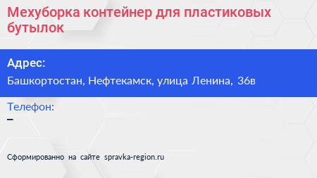 Мехуборка, контейнер для пластиковых бутылок по адресу Башкортостан, Нефтекамск, улица Ленина, 36в в дальнейшем Организация, размещена в следующих категориях: