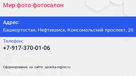 Мир фото, фотосалон по адресу Башкортостан, Нефтекамск, Комсомольский проспект, 26 в дальнейшем Организация, размещена в следующих категориях: