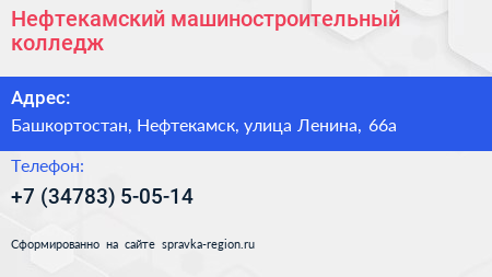 Нефтекамский машиностроительный колледж по адресу Башкортостан, Нефтекамск, улица Ленина, 66а в дальнейшем Организация, размещена в следующих категориях: