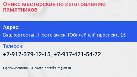 Оникс, мастерская по изготовлению памятников по адресу Башкортостан, Нефтекамск, Юбилейный проспект, 15 в дальнейшем Организация, размещена в следующих категориях: