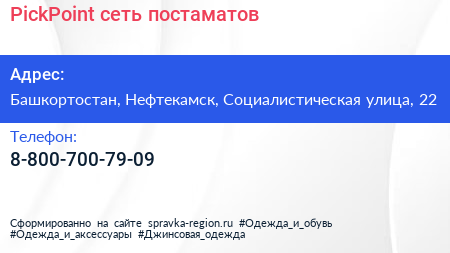 PickPoint, сеть постаматов по адресу Башкортостан, Нефтекамск, Социалистическая улица, 22 в дальнейшем Организация, размещена в следующих категориях: