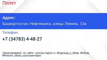 Полет по адресу Башкортостан, Нефтекамск, улица Ленина, 13а в дальнейшем Организация, размещена в следующих категориях: