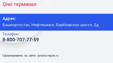 Qiwi, терминал по адресу Башкортостан, Нефтекамск, Берёзовское шоссе, 2д в дальнейшем Организация, размещена в следующих категориях: