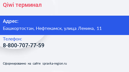 Qiwi, терминал по адресу Башкортостан, Нефтекамск, улица Ленина, 11 в дальнейшем Организация, размещена в следующих категориях: