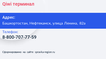 Qiwi, терминал по адресу Башкортостан, Нефтекамск, улица Ленина, 82а в дальнейшем Организация, размещена в следующих категориях: