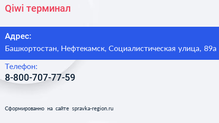 Qiwi, терминал по адресу Башкортостан, Нефтекамск, Социалистическая улица, 89а в дальнейшем Организация, размещена в следующих категориях: