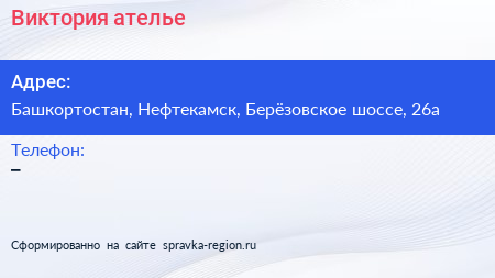 Виктория, ателье по адресу Башкортостан, Нефтекамск, Берёзовское шоссе, 26а в дальнейшем Организация, размещена в следующих категориях: