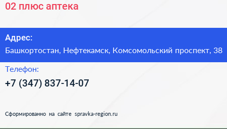 02 плюс, аптека по адресу Башкортостан, Нефтекамск, Комсомольский проспект, 38 в дальнейшем Организация, размещена в следующих категориях: